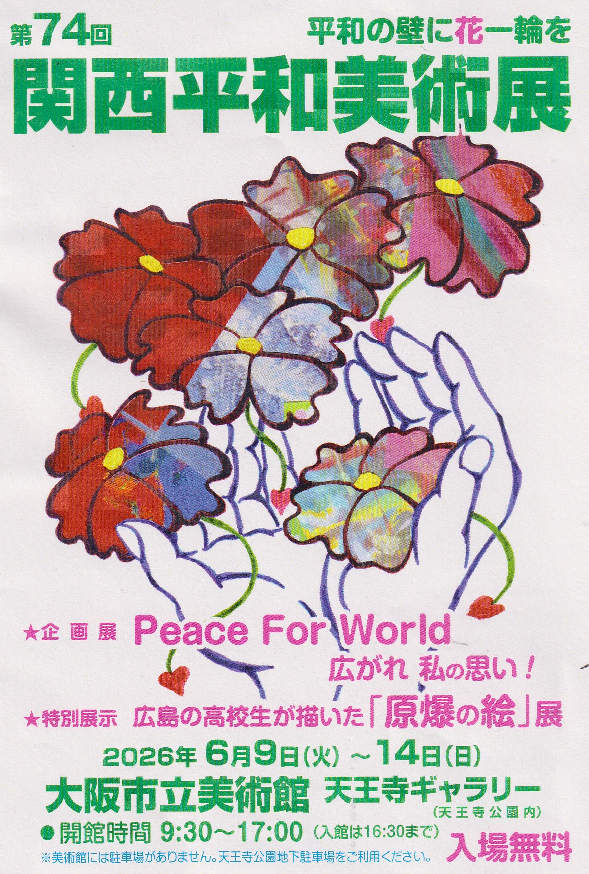 2026年 第74回 関西平和美術展出品要綱は3月22日発送いたします。3月末までに届かない方、また出品を考えておられる方は、事務局までお問い合わせください。平和を愛する方の多くの出品をお待ちしています (^^)/